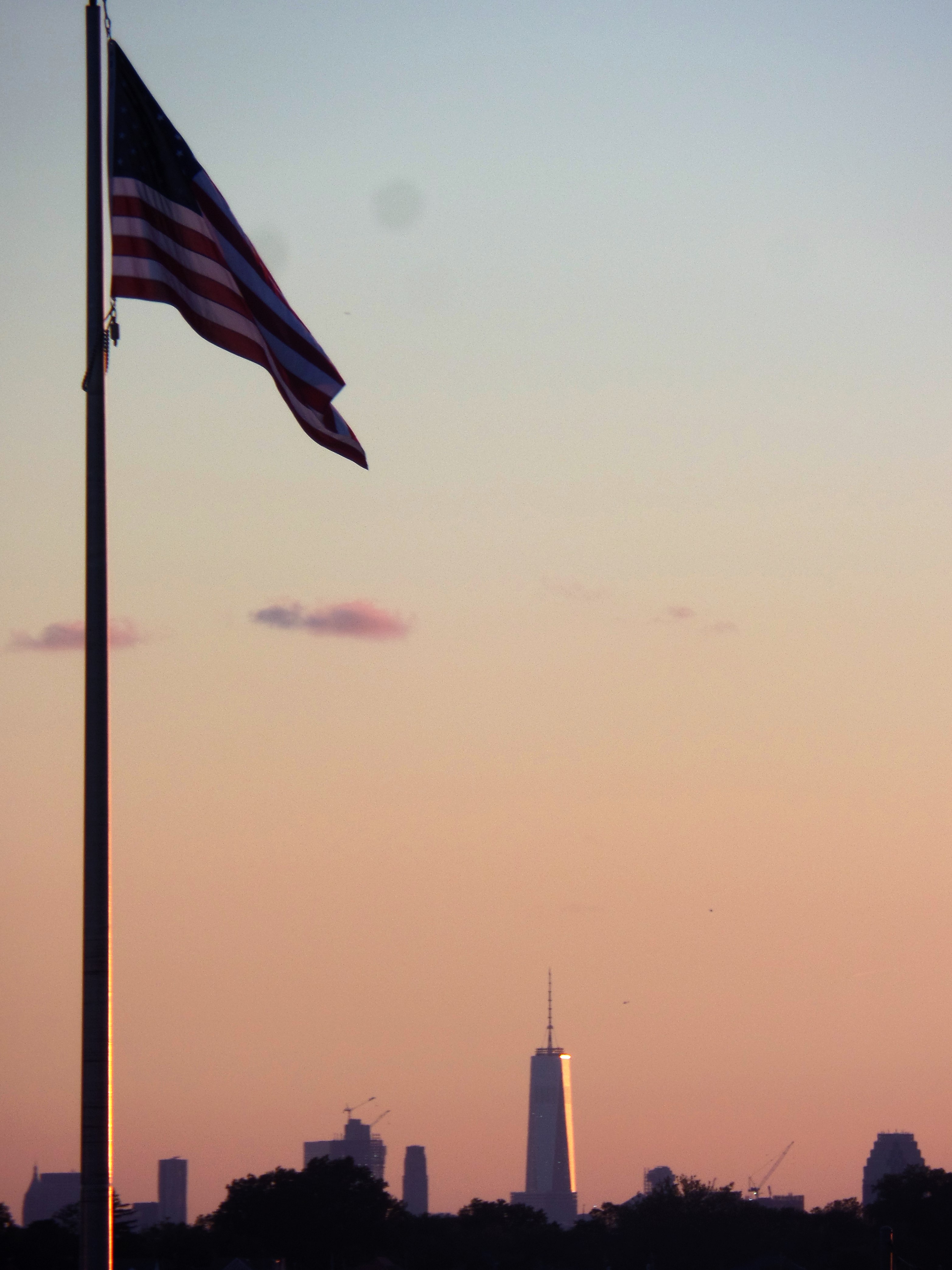 A beautiful, clear night to gaze on The Freedom Tower next to Old Glory.