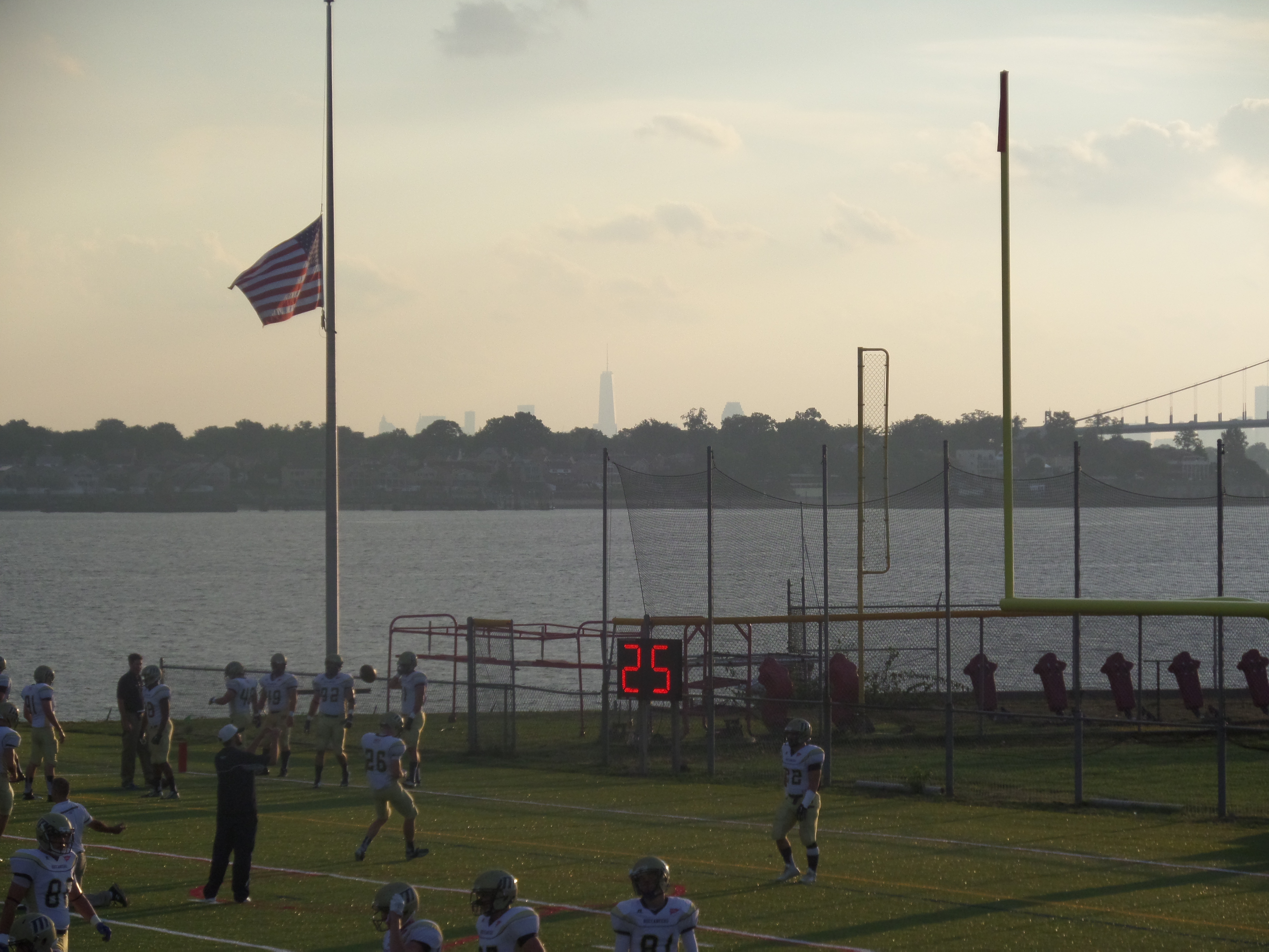 At the 2014 D3 Mass Maritime vs. SUNY Maritime game in Throggs Neck, NY, first responders and military were honored at the 9/11 game with the new Freedom Tower seen high above New York City a few miles away.