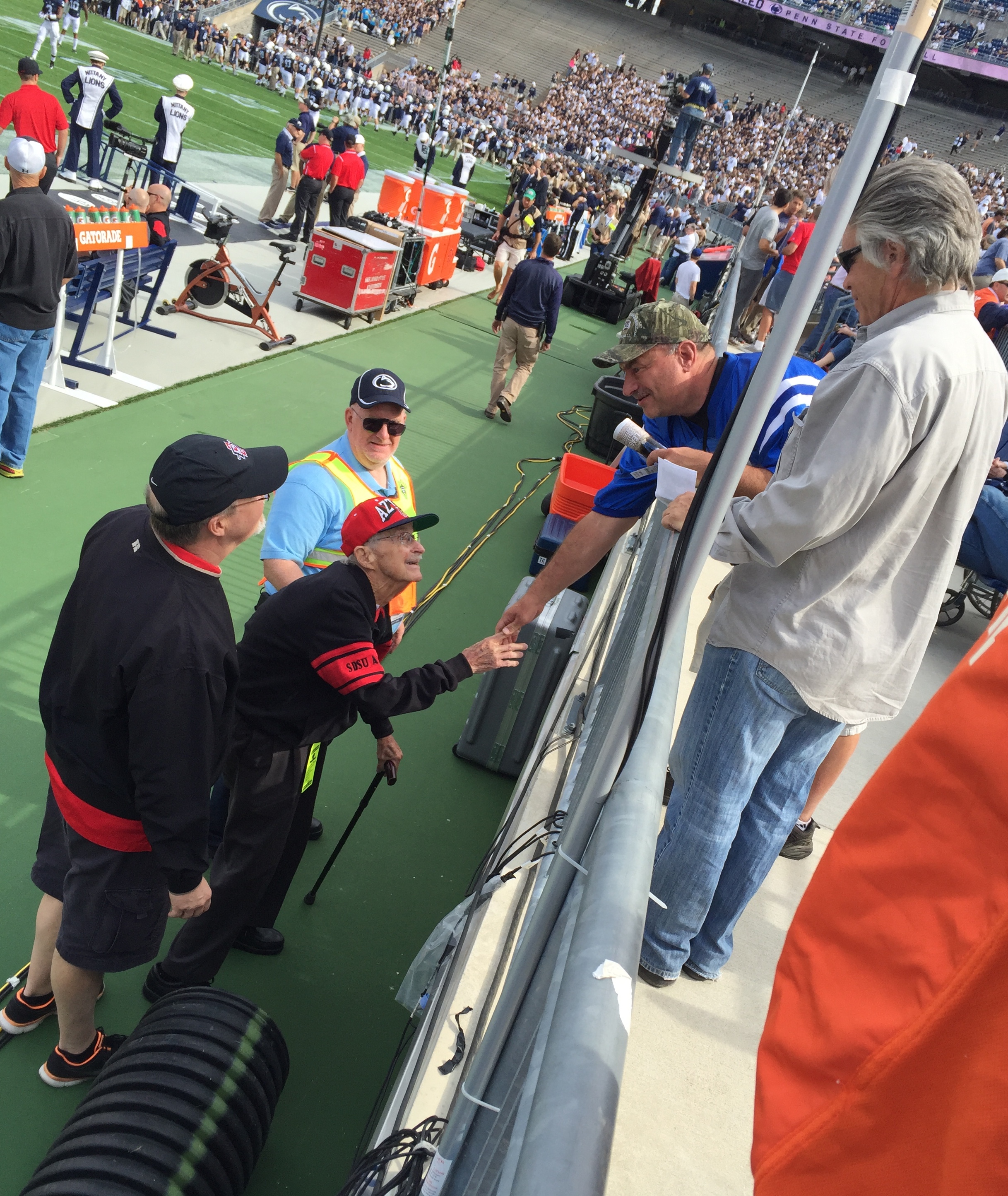 It was a great day for tailgating. Besides Tom and Ken Ables coming out to State College from San Diego for the first time, I also brought along a couple of other first-timers to Beaver Stadium as well. Dave Headden ( Ohio Wesleyan) and Mike Ford (Providence College) came to enjoy great weather and great tailgate food including beef brisket served up by John and Kelle Massimilla as part of the pre-game tailgate festivities. My daughter, Alex, a disappointed South Carolina Gamecock graduate with her alma mater struggling so far this season, also joined up as she had enjoyed many visits to State College since she was a little kid. Also meeting up with us a little while before the game was long-time CFF fan “Seton (Hall)” Fred Bacchetta and his sons Mark (Delaware) and Stephen (Montclair State). Living in Roxbury, NJ, they’d come to see their good friend Angelo Mangiro start at center for the Nittany Lions. “Evan Williams” and “Jeremiah Weed” also made guest appearances. It was a great time and a good game with a lot of memorable plays according to Mike Ford. He and Dave said they’d like to do it again and possibly see the Lions play a Big Ten opponent in the future. Mike wants to still try to figure a way he can bring down some lobsters from Rhode Island next time he joins to add to our tailgate. We convinced him this time that it would be too difficult to get a boiling pot to cook them right this time. Mike couldn’t leave after the game without finding a PSU “Happy Valley” shirt that he purchased after the game to wear back in his native Rhode Island. He remembers way back when Penn State defeated Texas in the 1971 Cotton Bowl. It made his late father very happy that a team from the east was making a mark for itself showing that a program from out here could beat the best from anywhere else.