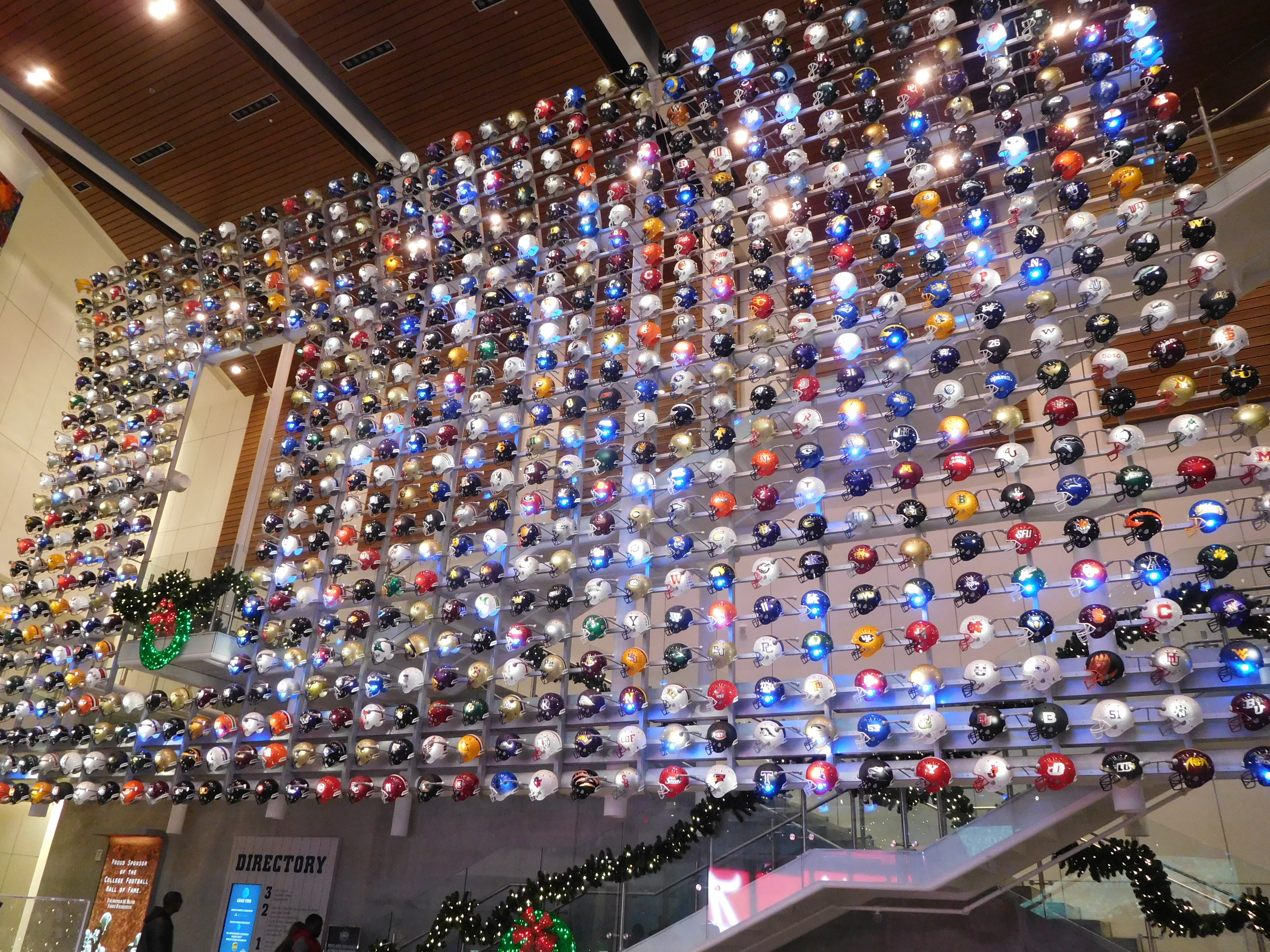 The wall of helmets when you first enter teh College Football Hall of Fame.