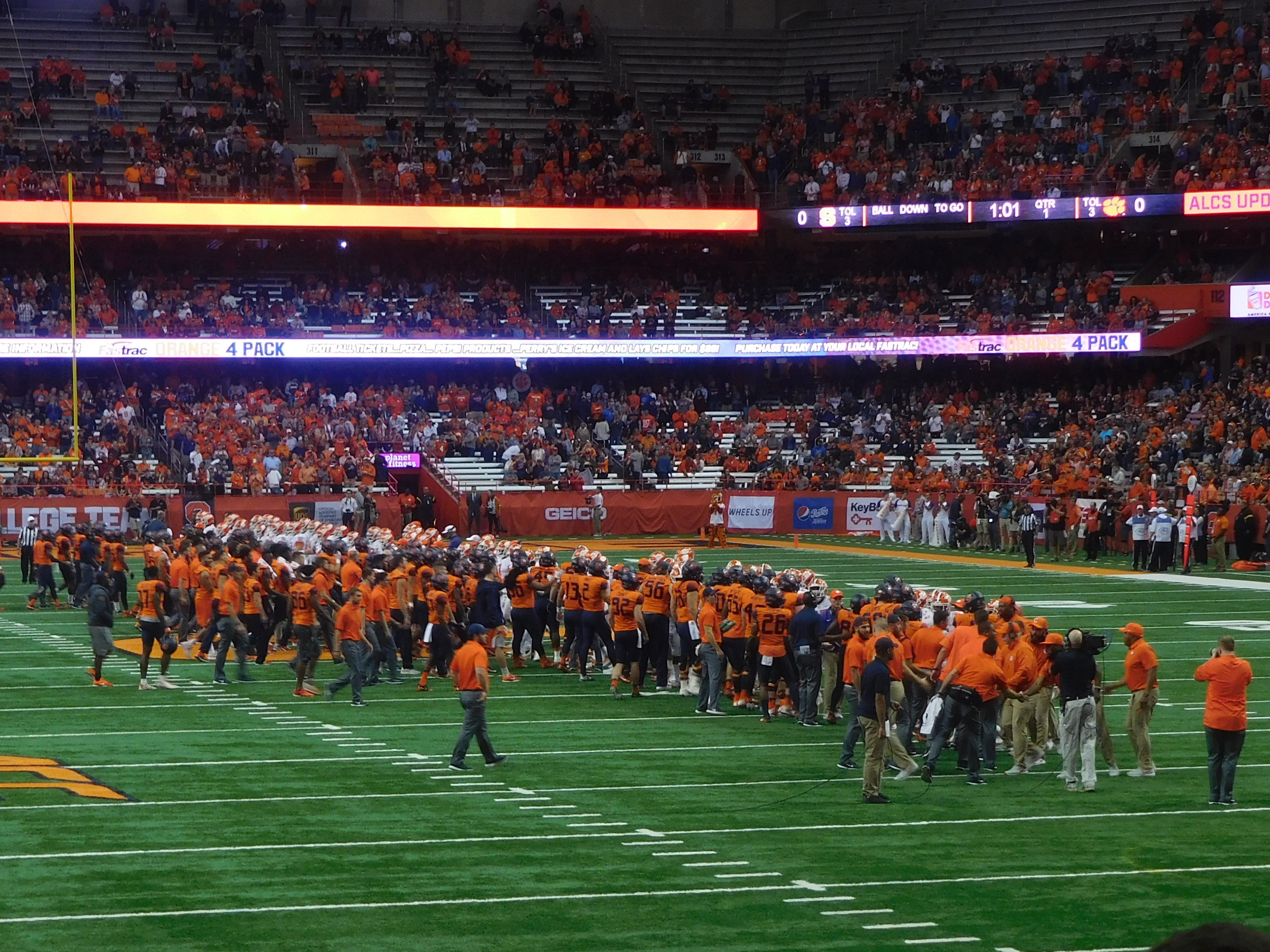 As per ACC standards, Syracuse and Clemson players display sportsmanship before kick-off.