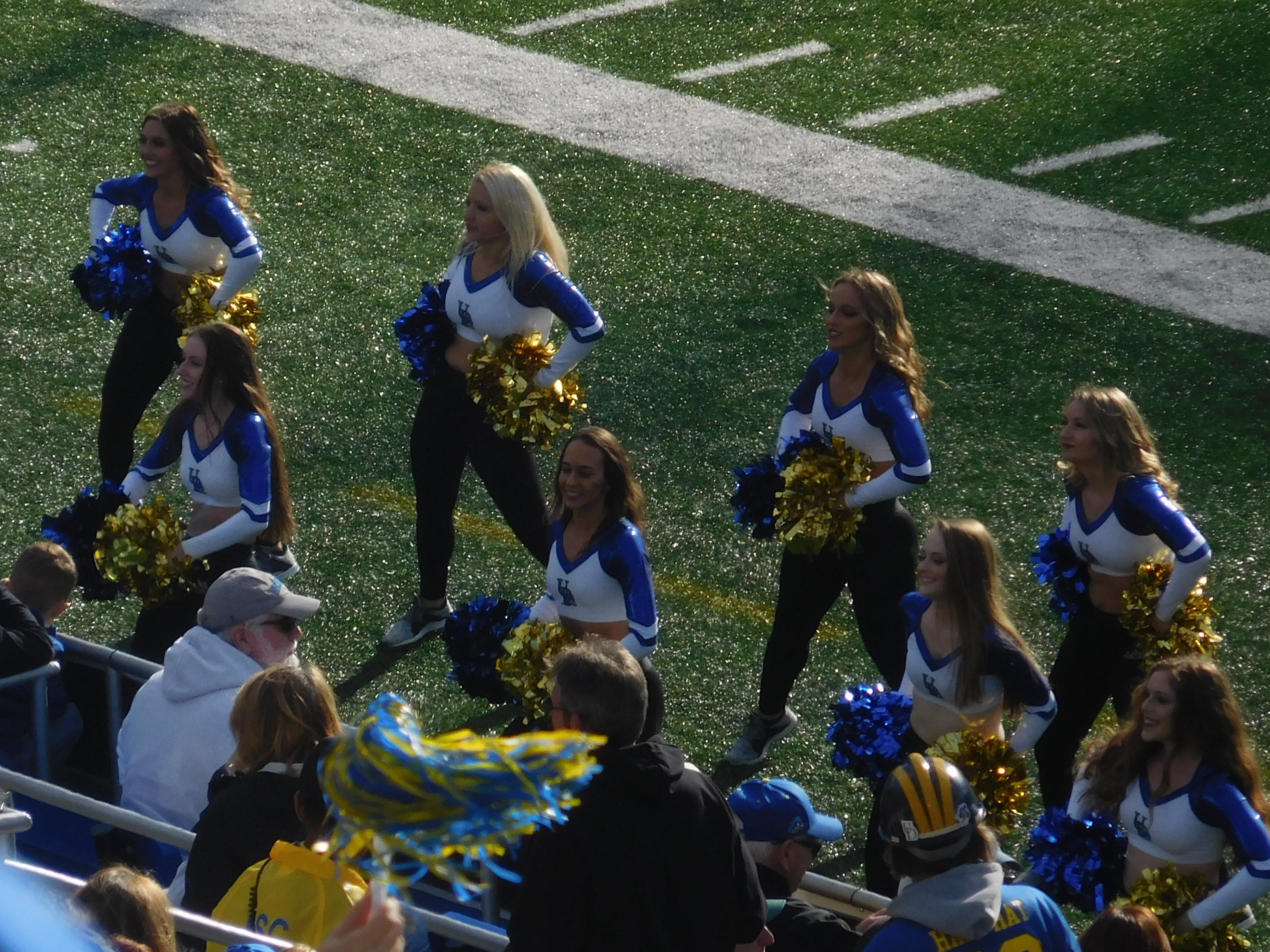 Delaware cheerleaders perform at the 2018 Elon game. That looks like our pal Navy Al in the baseball cap who always prefers his front row seat no matter where he goes!