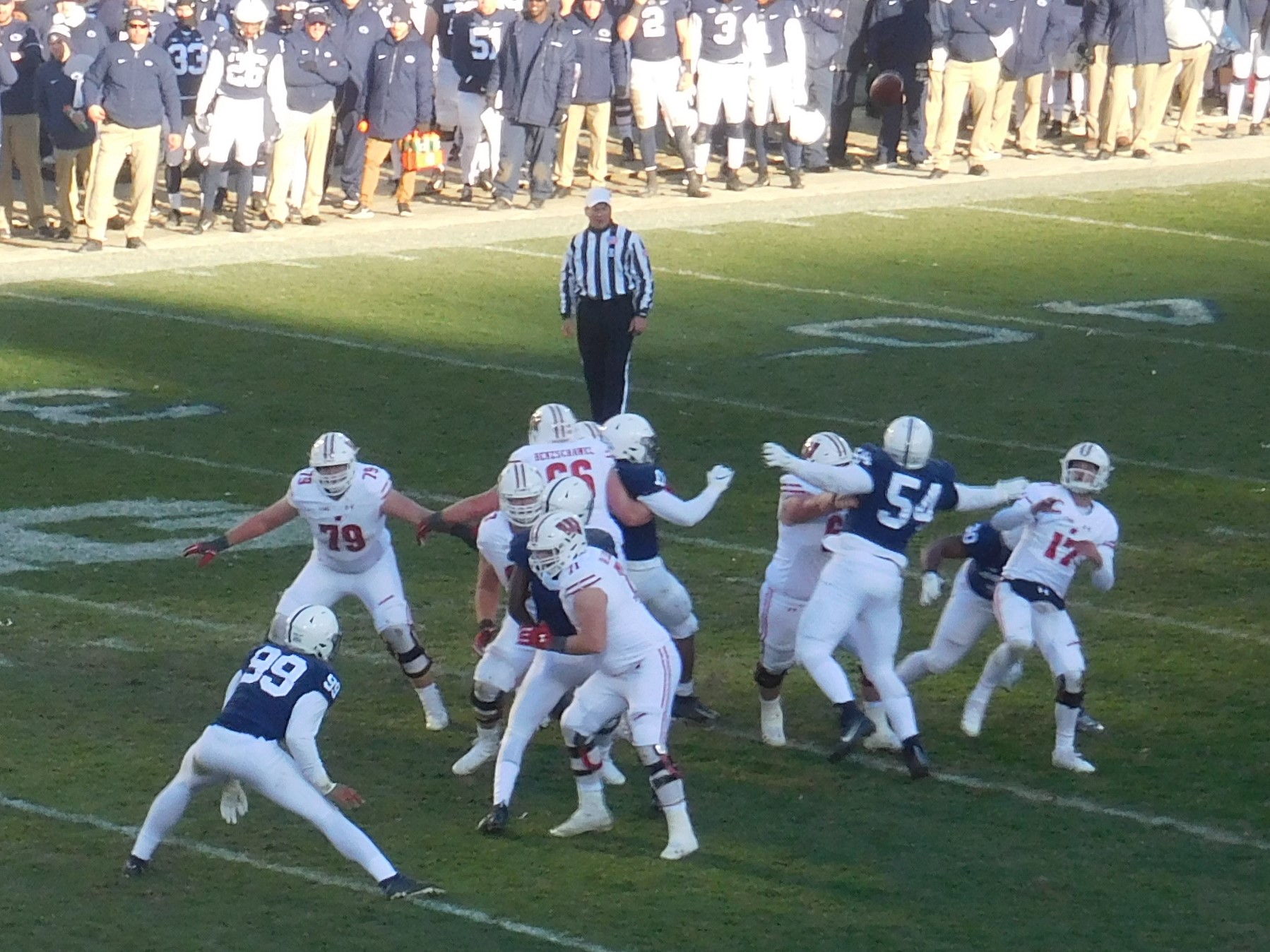 Penn State DTs Robert Windsor and Kevin Givens (30) “badger” Wisconsin QB Jack Coan (17). He’ll need to apply pressure up front against Patrick Mahoes, a tough chore, this Sunday.