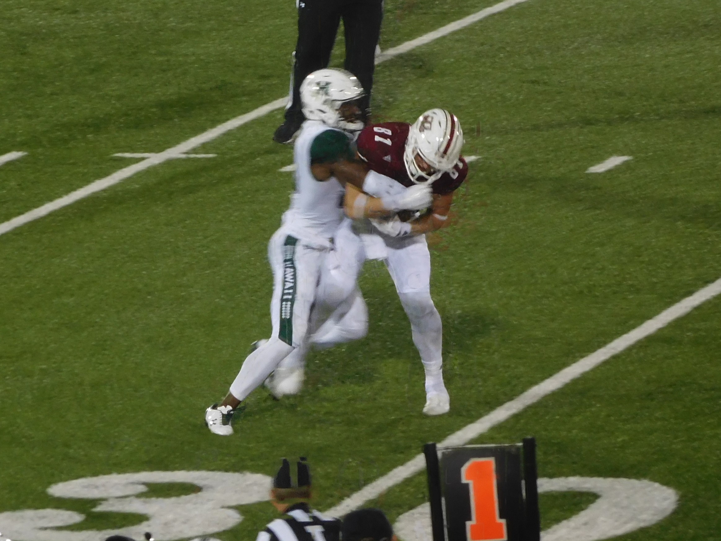 Home→Steve-o's Game Reviews→Game 533: Rainbow Warriors come up sevens to defeat Minutemen in last minute of play, 38-35 →TE Adam Breneman fights for 9 yard catch