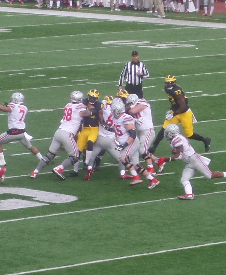 Ohio State C Pat Elfein pulls left to led Ezekial Elliot around left end in OSU’s victory over Michigan in 2015. Elfein was taken at # 70 by the Minnesota Vikings.