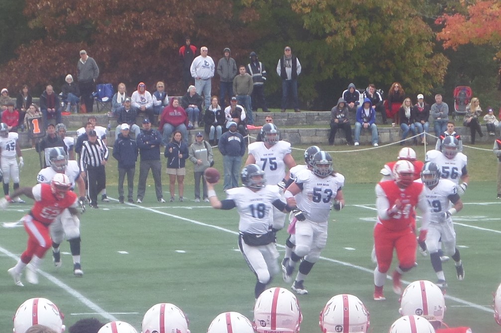 USD QB Anthony Lawrence fires a pass to get his team near the goal line.